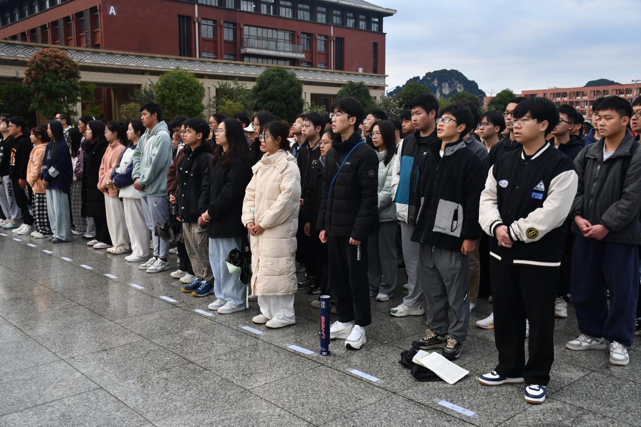 伴随着庄严的《义勇军进行曲》,鲜艳的五星红旗冉冉升起,全体师生向国旗行注目礼,高声齐唱国歌。