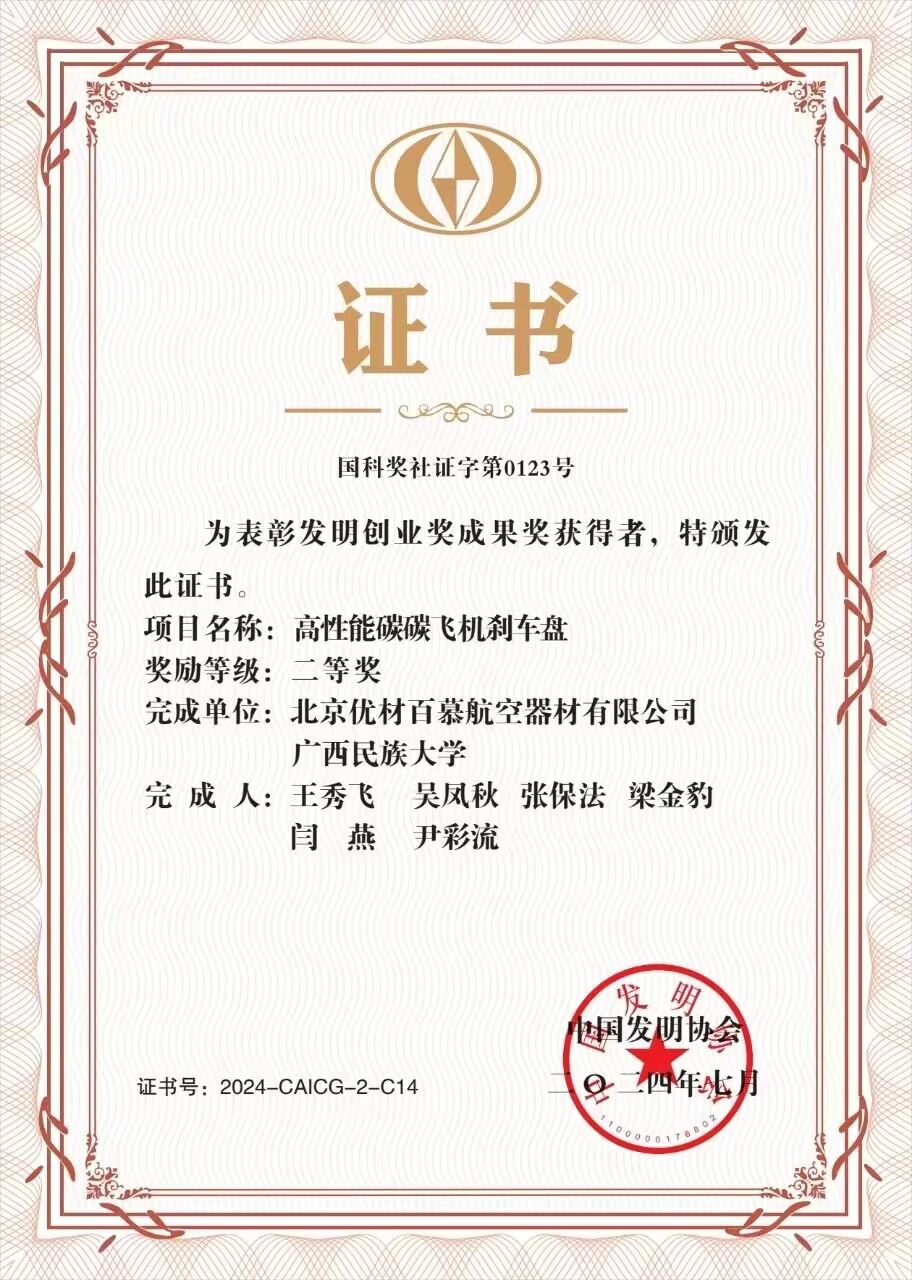 近日,2024年度发明创业奖名单正式发布,乐天使尹彩流研究员参与的项目“高性能碳碳飞机刹车盘”荣获中国发明协会创业奖成果奖二等奖。该奖项是由国家科技部批准,中国发明协会设立的国家级奖项,旨在促进产学研深度融合,推动发明创新事业高质量发展。