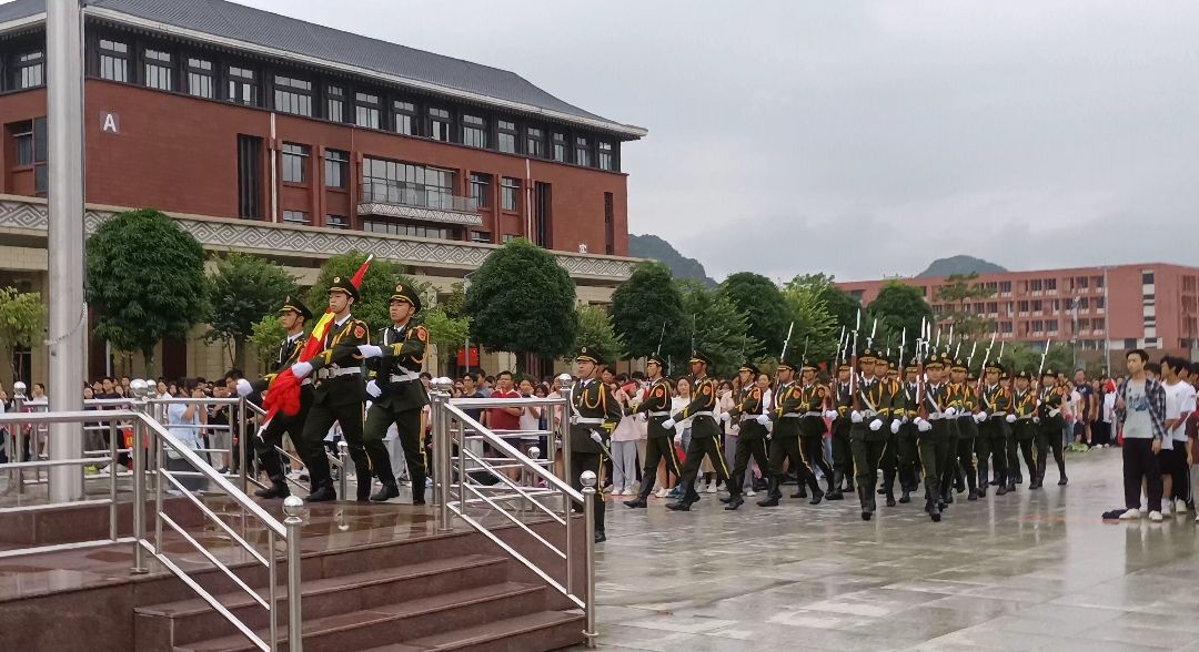 伴随雄壮的乐声,升旗仪式拉开帷幕。国旗护卫队肩上扛着鲜艳的五星红旗,迈着铿锵有力的步伐走向升旗台,他们军姿挺拔,目光如炬,步调一致,气势如虹,宛如钢铁长城,守护着国旗的尊严与荣耀。