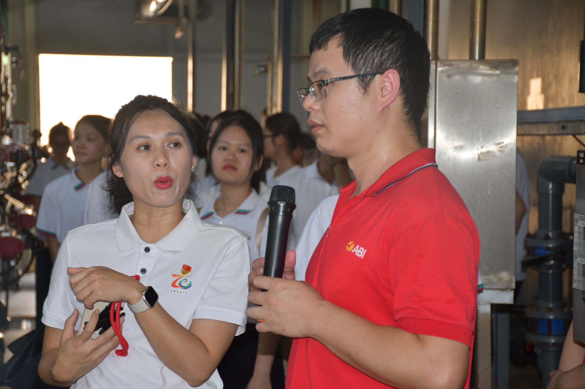 (百威〔南宁〕啤酒有限公司技术人员向乐天使师生讲解中水回用工艺)