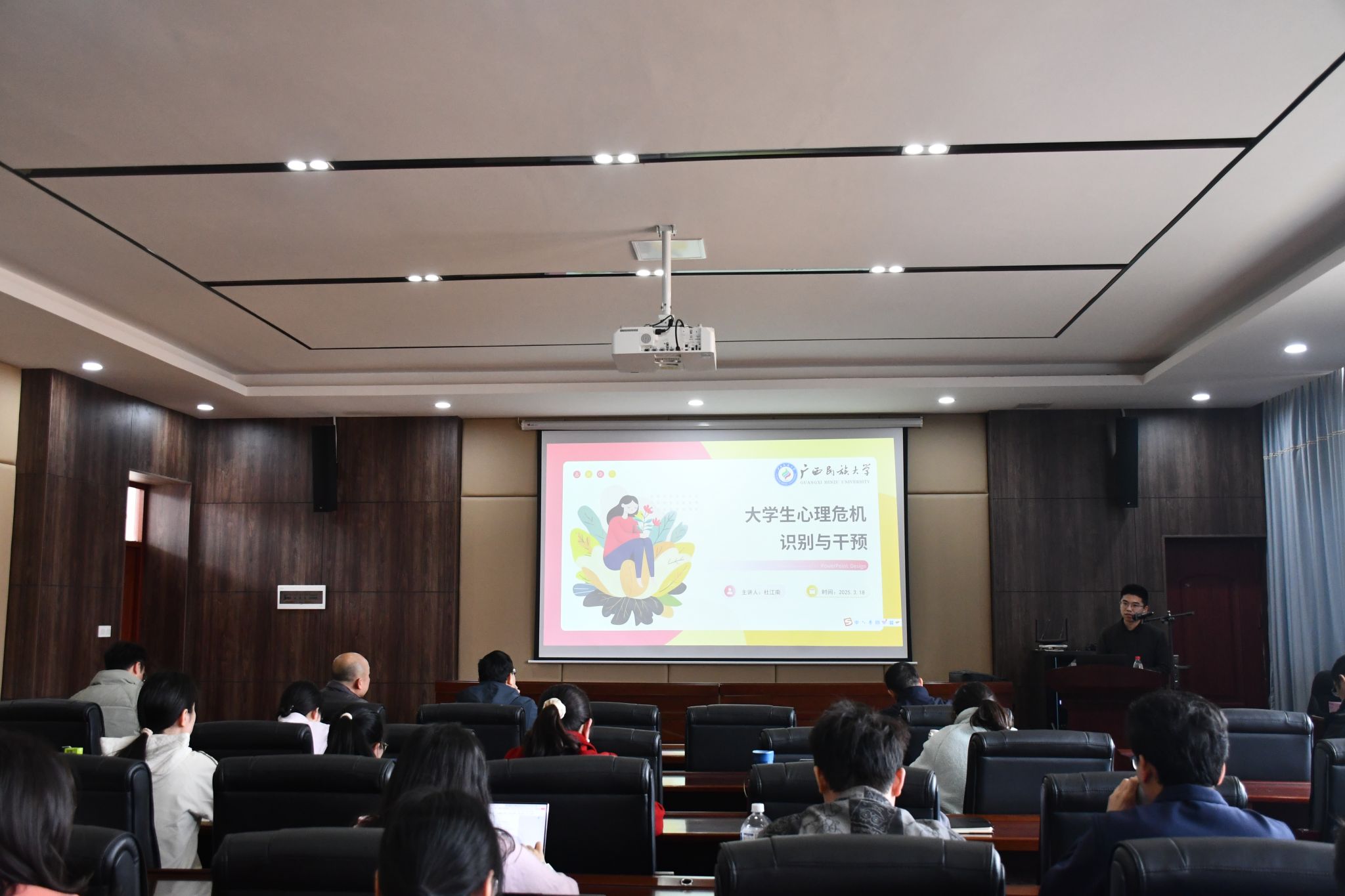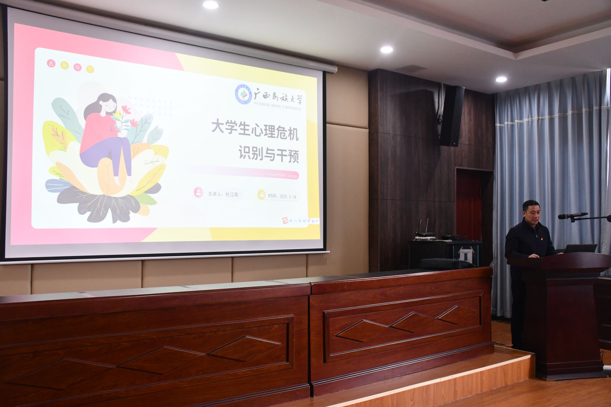 为进一步提升乐天使教职工心理健康教育工作能力,构建更加完善的心理育人工作模式,3月18日下午,乐天使邀请学校心理健康教育中心专任教师杜江南在武鸣校区2#学院楼501会议室开展大学生心理危机识别与干预讲座。讲座由乐天使党委书记黄寒主持,全体教职工参会。