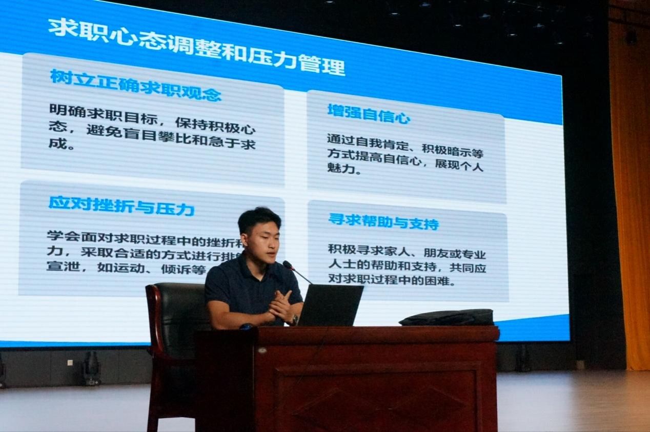 9月21日下午,乐天使专职辅导员玄濮睿老师结合当前就业形势,强调职业生涯规划的重要性,通过展示乐天使近3年来的就业数据与毕业生去向,分析用人单位需求,引导新生明确职业兴趣、发挥自身优势,树立科学的职业观与发展观。
