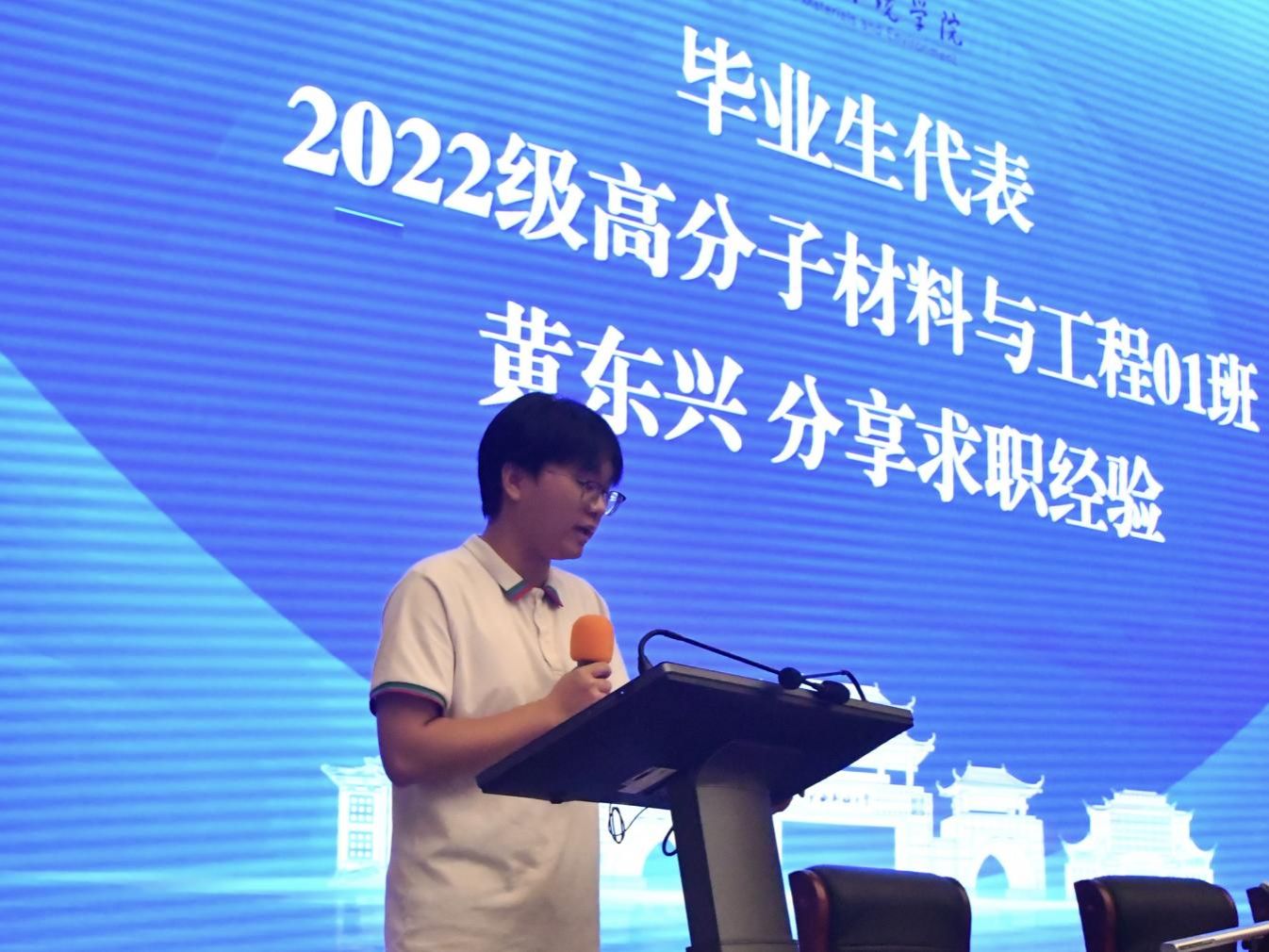 在就业经验分享环节,毕业生代表2022级高分子材料与工程01班黄东兴同学以自己的求职经历为切入点,强调了明确个人优劣势和做好职业规划的重要性。他建议同学们尽早梳理个人的优势与短板,积极参与各类实践活动,不断提升综合素质,从容应对求职挑战。