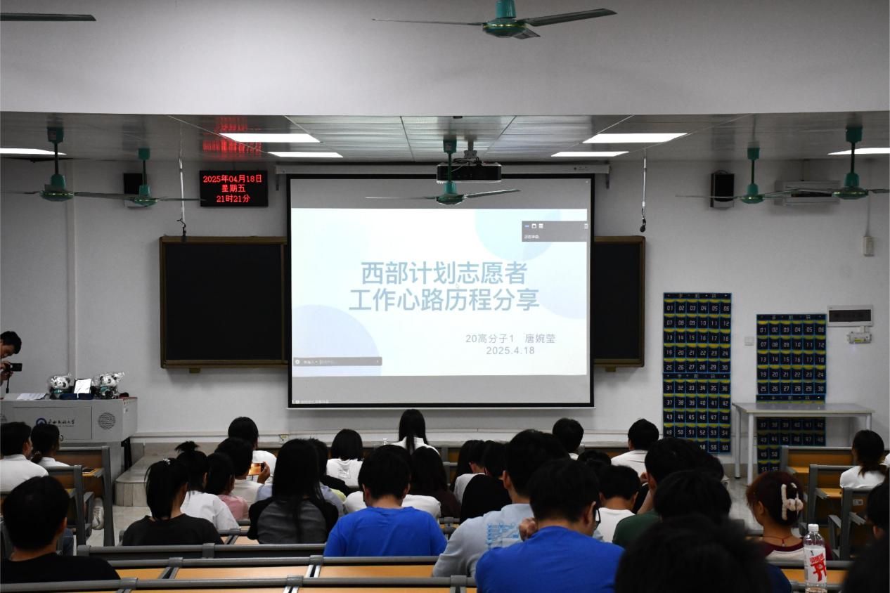 在西部计划志愿者心路历程分享环节,2024届高分子材料与工程毕业生党员唐婉莹同志为大家分享了自身参与西部计划志愿者工作的心路历程,详细介绍西部计划内容及报名流程,特别解读了西部计划的政策保障和发展前景。现场,唐婉莹同志与同学们进行交流,解答了同学们关于西部计划志愿者项目的疑问,如工作条件、生活待遇、未来发展路径等。她用自己的亲身经历告诉大家,西部计划志愿者工作是一次难得的人生历练机会,能够让人快速成长,也能为国家西部地区的发展贡献自己的力量,实现个人价值。