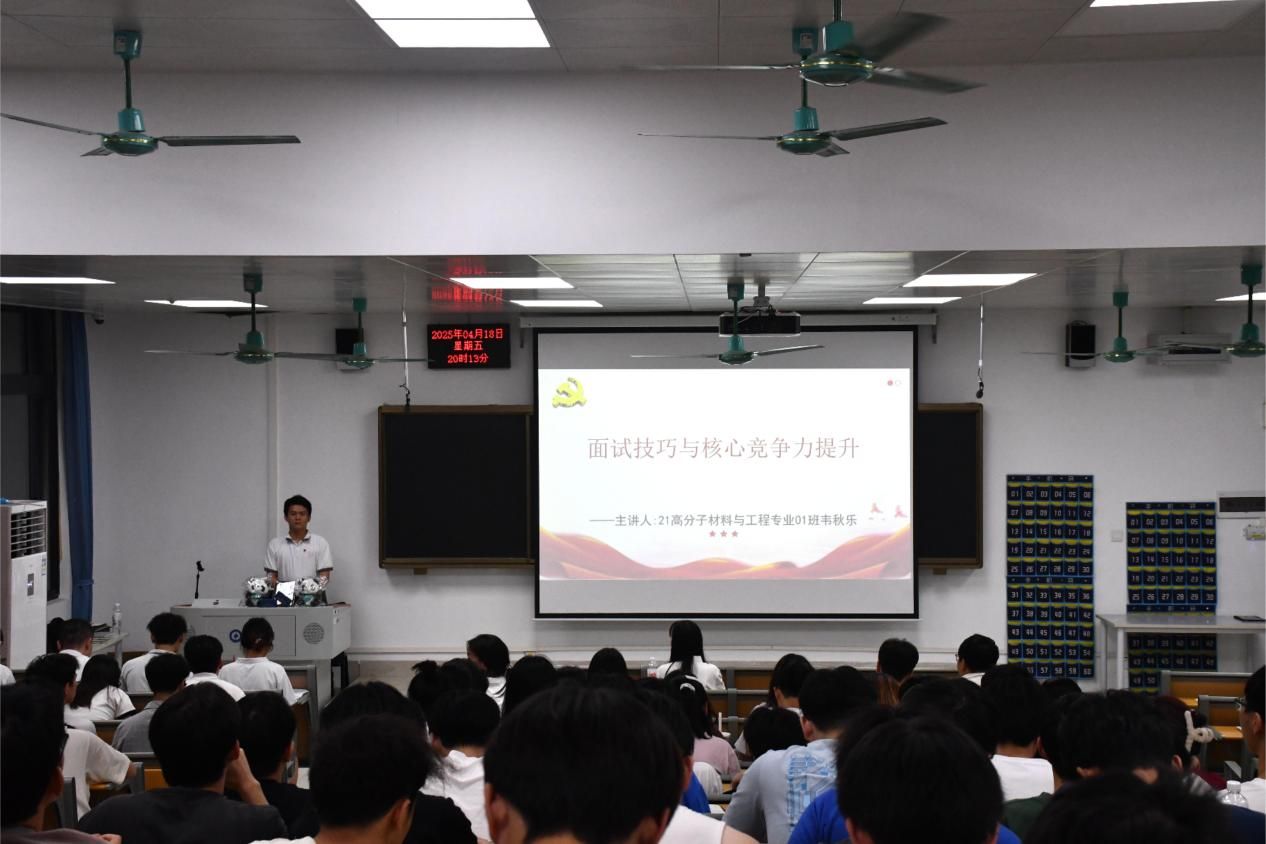 在面试技巧的经验分享环节,2021级高分子材料与工程专业的韦秋乐同志为大家系统地讲解了面试的类型,通过讲述自身的面试经历为大家简要介绍面试时会遇见的问题,并结合自身经验为大家分享面试技巧。分享结束后,韦秋乐同志与现场同学进行交流,解答了同学们对面试流程中的疑惑,如如何着装、如何表达自身优势、如何回答棘手问题等。