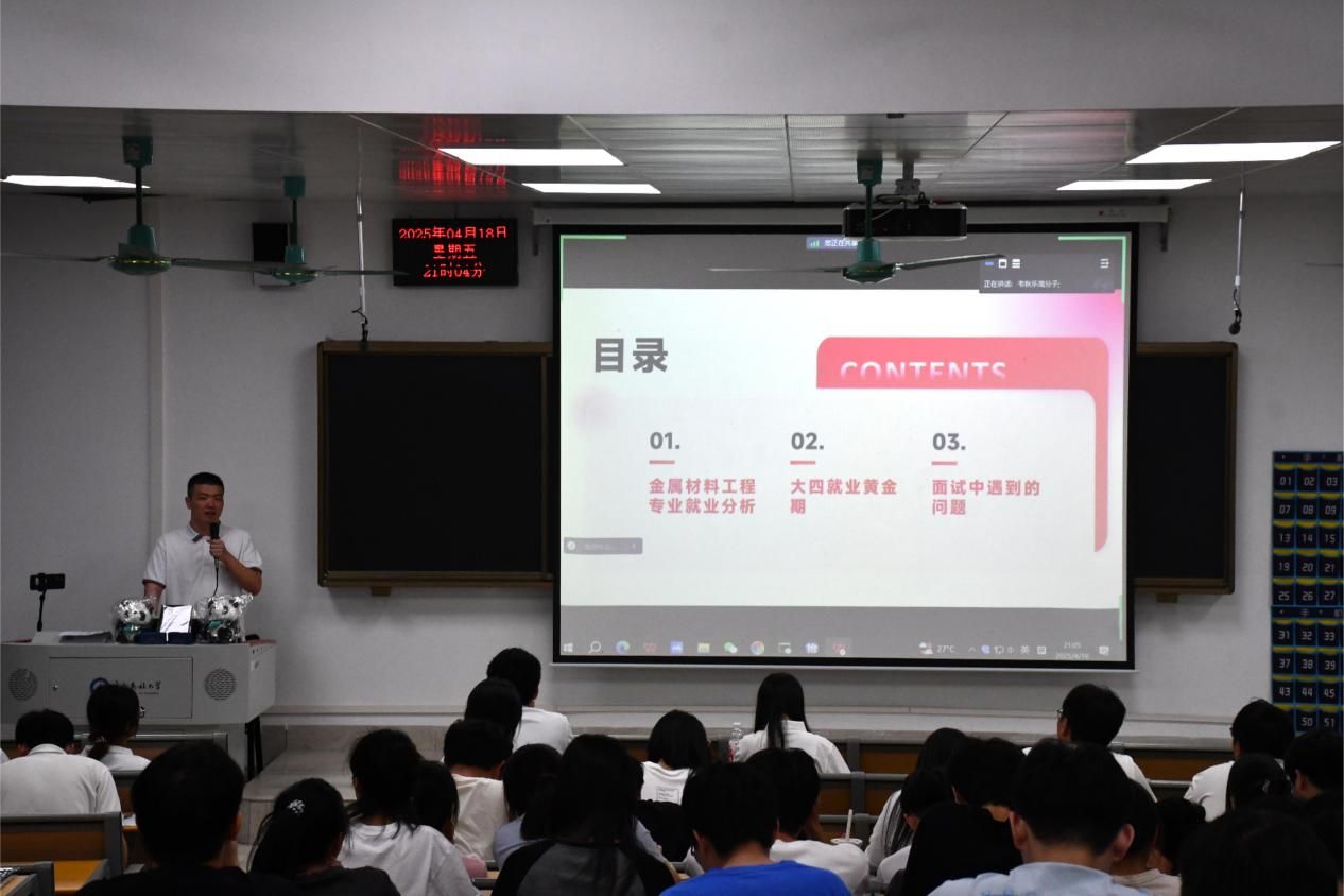 活动第三个环节,2021级金属材料工程专业的梁元超同志为大家分析了金属专业的就业前景,讲述了金属材料工程专业的就业技巧和求职方向,鼓励大家要认真学习专业技能,重视毕业实习,努力提升个人就业竞争力。