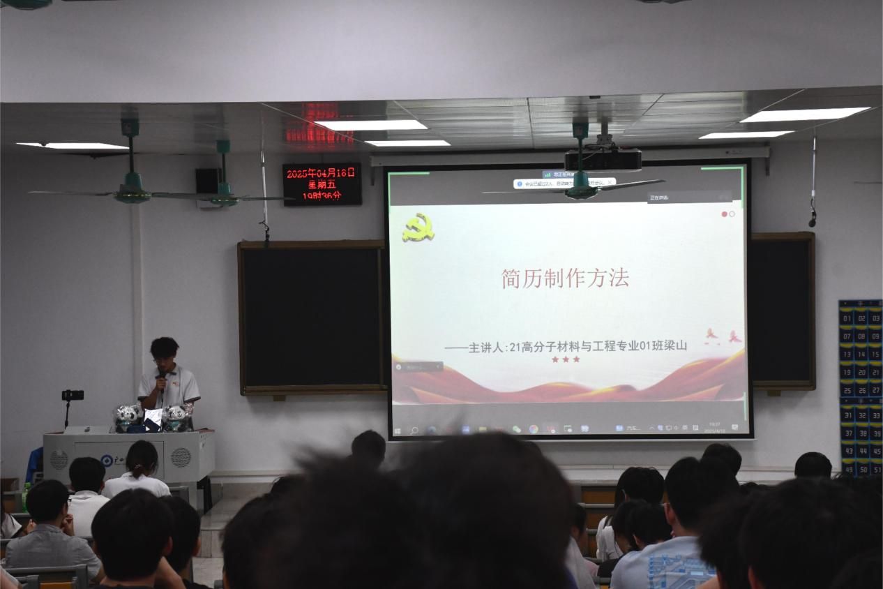 在简历制作的经验分享环节,2021级高分子材料与工程专业的梁山同志先为大家讲述了自身及身边同学的简历制作经历,提醒同学们警惕网络简历制作骗局。随后,梁山同志现场分享个人简历,为同学们逐步分析简历制作要点,并向大家展示了利用AI软件完善个人简历、查找求职公司的技巧。本环节的分享结束后,梁山同志与现场同学进行交流,解答了同学们的相关问题。