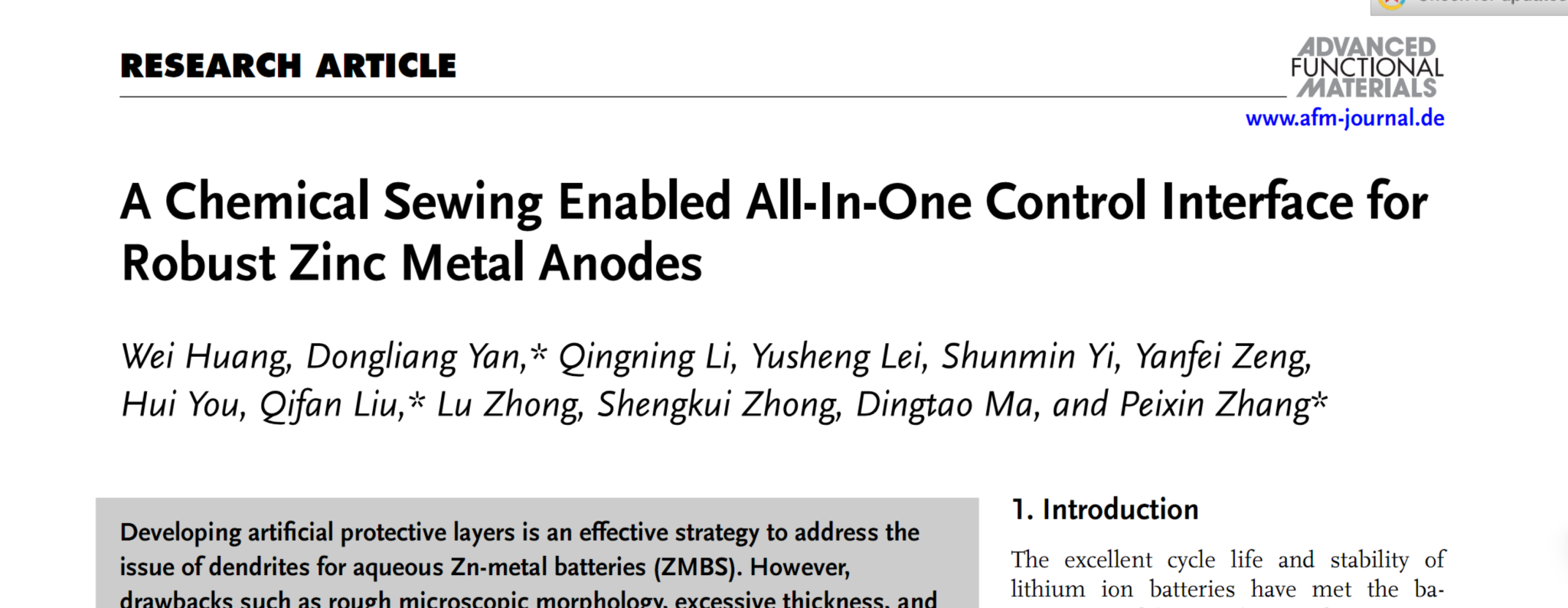 近日,我校材料与环境学院颜东亮教授团队与深圳大学张培新教授团队合作在锌离子电池研究领域取得重要研究进展,相关研究成果以“A chemical sewing enabled all-in-one control interface for robust zinc metal anodes”为题发表在材料学国际顶级期刊《Advanced Functional Materials》上,这是我校首次以第一完成单位、第一通讯单位在该权威期刊上发表研究成果。